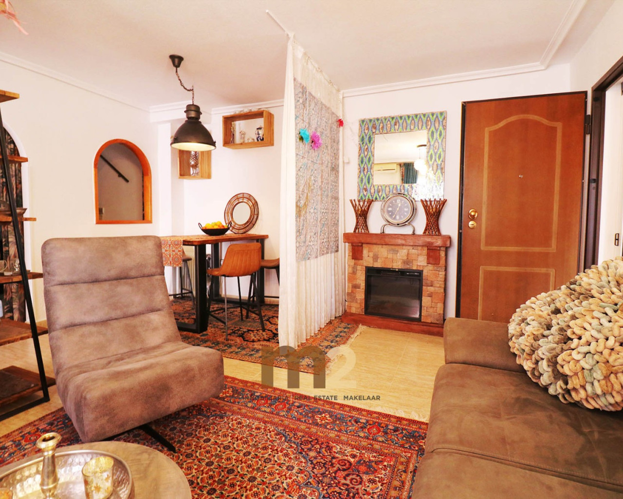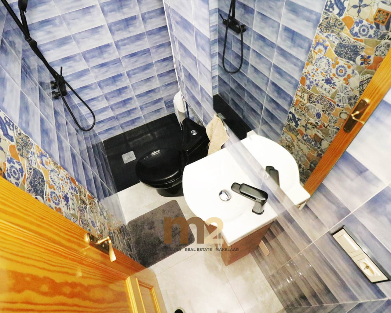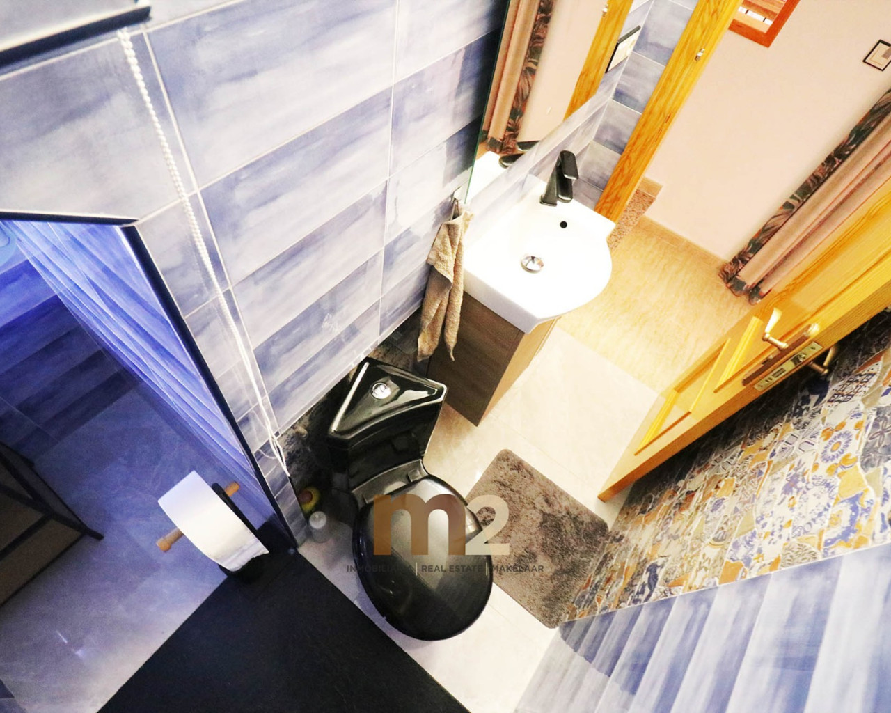 On the ground floor, you’ll find a cozy living-dining room, a bedroom with a fitted wardrobe, a full bathroom, a separate kitchen with utility area, as well as a front terrace with parking space, balcony, and storage room.