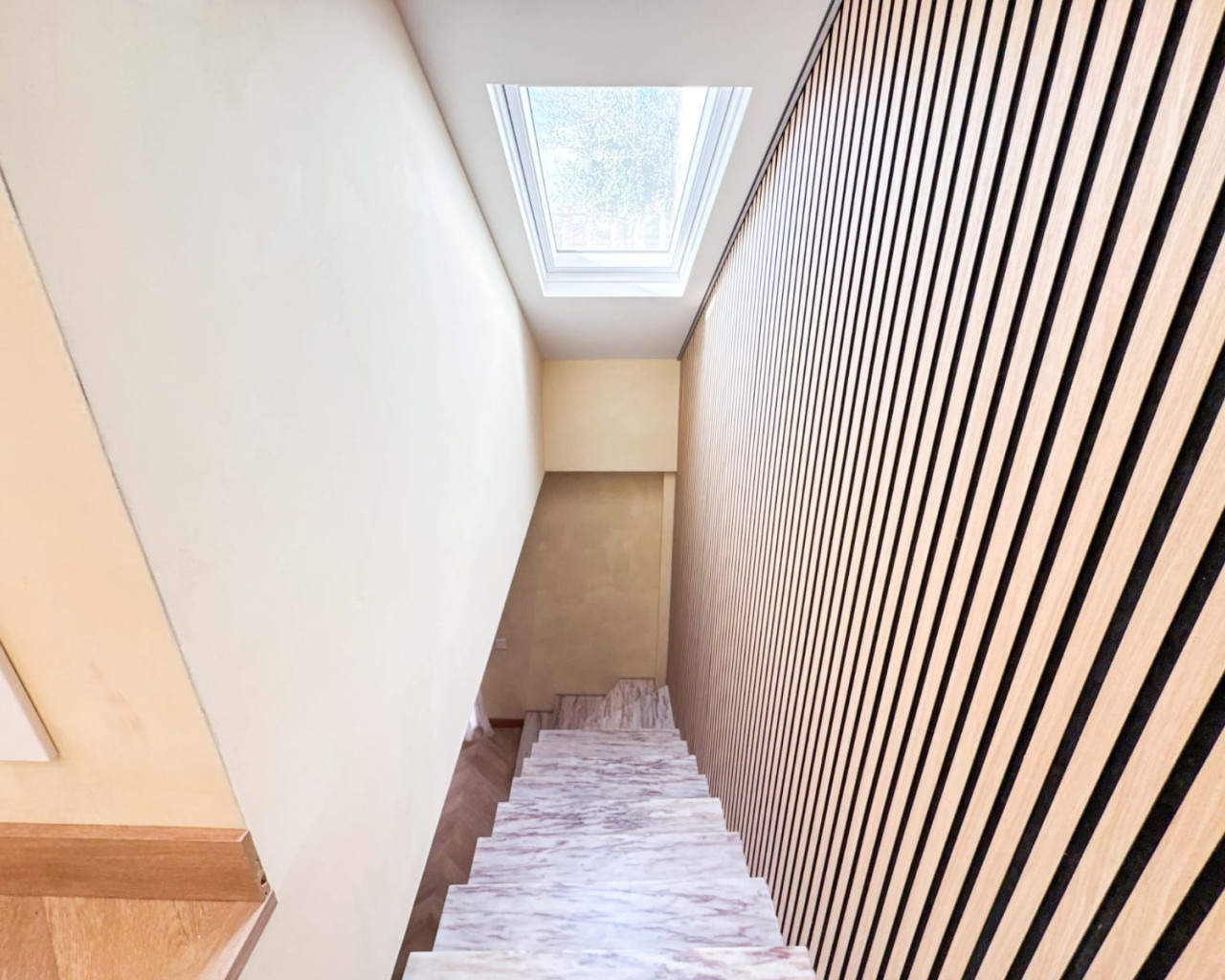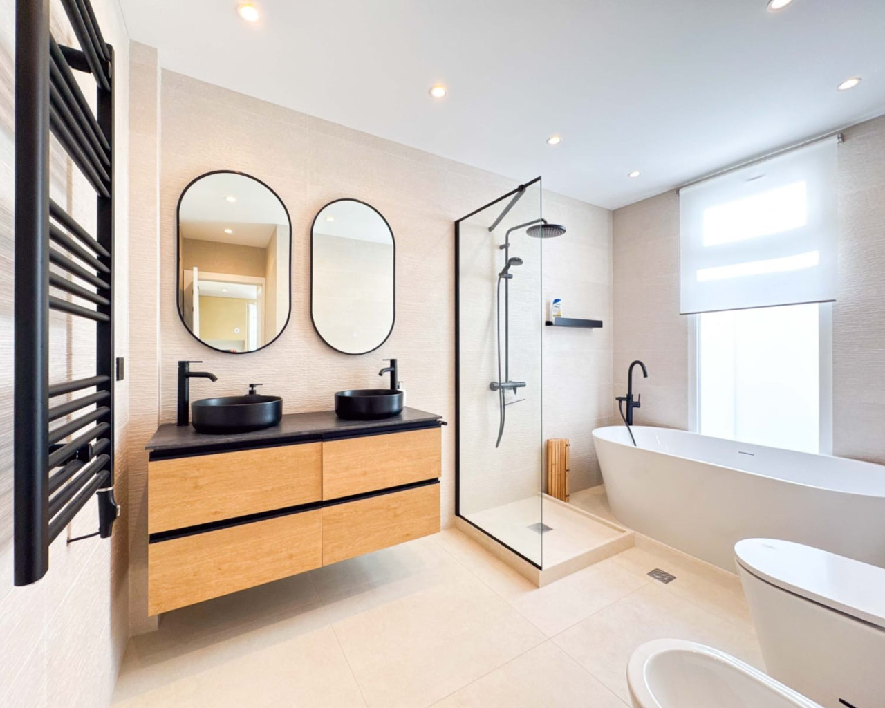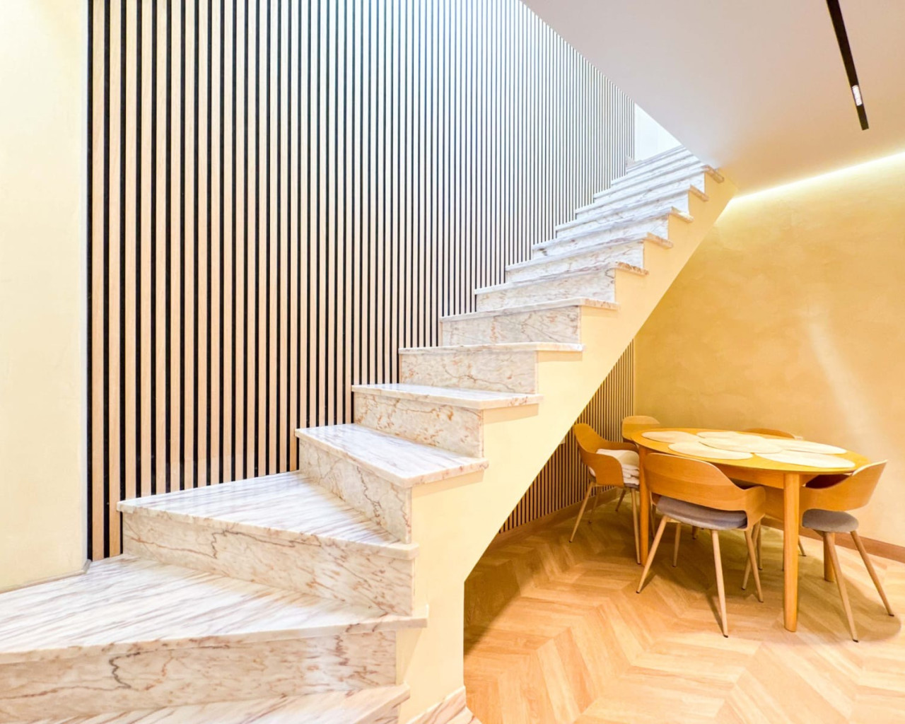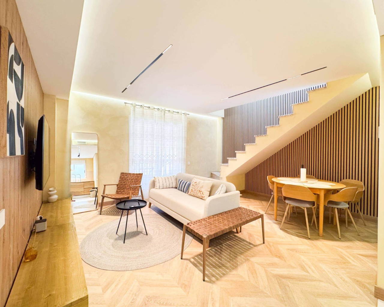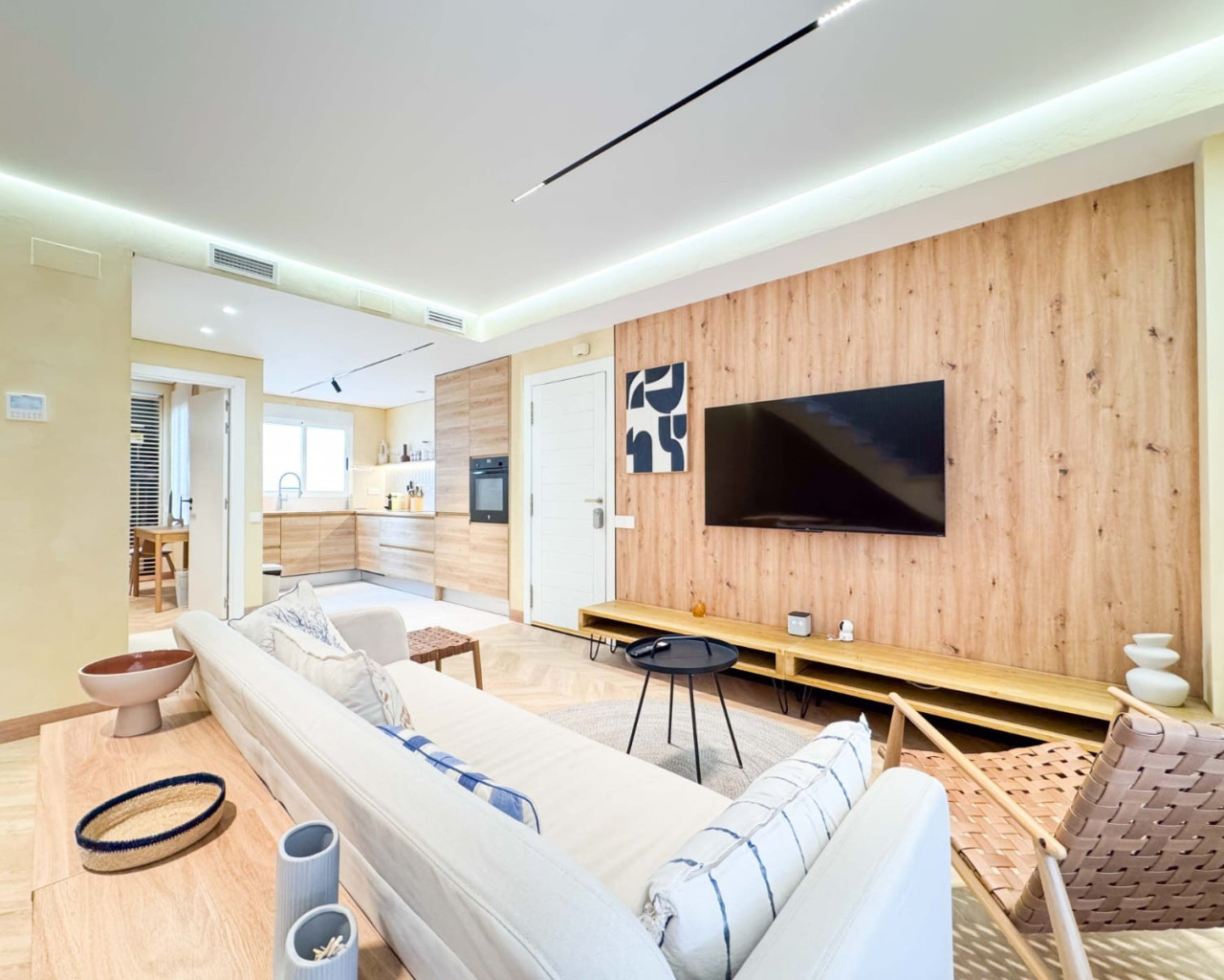 – Spacious and bright open-plan living-dining area with an integrated kitchen equipped with state-of-the-art appliances (induction hob with built-in extractor, oven, refrigerator, and dishwasher).